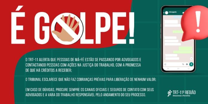 O Tribunal Regional do Trabalho da 11ª Região (AM/RR)alerta que pessoas de má-fé estão se passando por advogados e contactando pessoas com ações na Justiça do Trabalho, com a promessa de que há créditos a receber. Para que o suposto valor seja liberado, os criminosos convencem as vítimas fazerem depósitos para liberar uma “certidão” que autorizaria a liberação do valor.