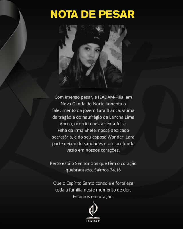 A Assembleia de Deus de Nova Olinda do Norte lamentou a morte da universitária Lara Bianca Bezerra Lopes, membro da igreja, e manifestou solidariedade à mãe da jovem, Shele, ao padrasto Wander e a todos os familiares. Em nota, a congregação afirmou permanecer em oração para que Deus conforte os corações neste momento de dor, citando o Salmo 34:18: “Perto está o Senhor dos que têm o coração quebrantado.”
