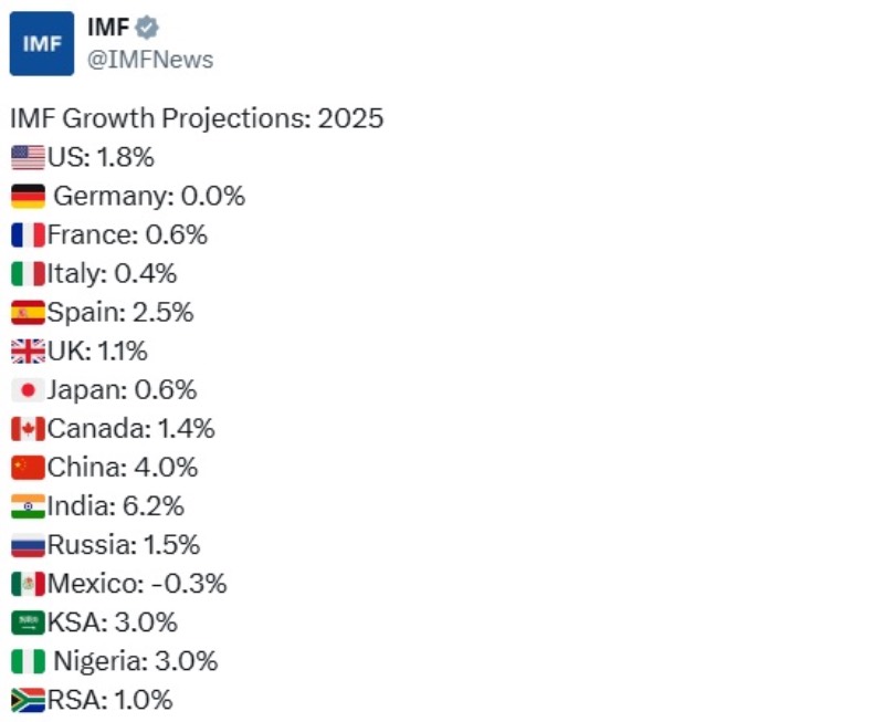 Canadá e México, também afetados pelas tarifas impostas pelo governo Trump, tiveram suas projeções revisadas negativamente. Para o Canadá, espera-se um crescimento de 1,4% em 2025 e de 1,6% em 2026 — ante os 2% anteriormente previstos para ambos os anos. Já para o México, o FMI projeta uma retração de 0,3% em 2025, o que representa uma queda expressiva de 1,7 ponto percentual em relação às estimativas de janeiro. Para 2026, o crescimento projetado é de 1,4%.