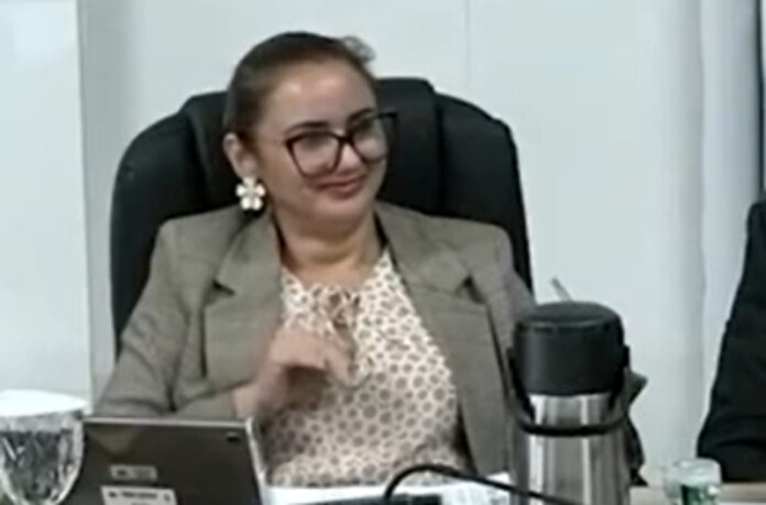 As imagens mostram a parlamentar sentada enquanto acompanhava a discussão entre colegas sobre a possibilidade de transferência das sessões legislativas para o período noturno. Durante o debate, um vereador questionava a necessidade da mudança e a disposição dos parlamentares em alterar suas rotinas.