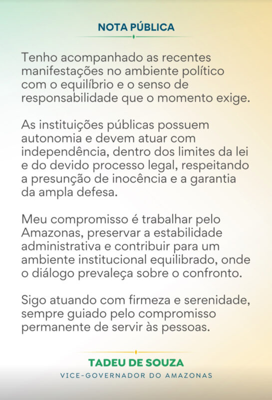 Em meio ao aumento da tensão no cenário político estadual, o vice-governador do Amazonas, Tadeu de Souza (PP), divulgou uma nota pública na manhã desta terça-feira (24) defendendo serenidade, diálogo e respeito às instituições, após os desdobramentos da operação Erga Omnes e falas do prefeito de Manaus, David Almeida (Avante), pré-candidato ao Governo do Estado.