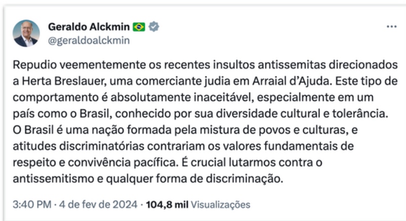 Em uma publicação no X (antigo Twitter), Alckmin expressou sua indignação, declarando: “Este tipo de comportamento é absolutamente inaceitável, especialmente em um país como o Brasil, conhecido por sua diversidade cultural e tolerância.”