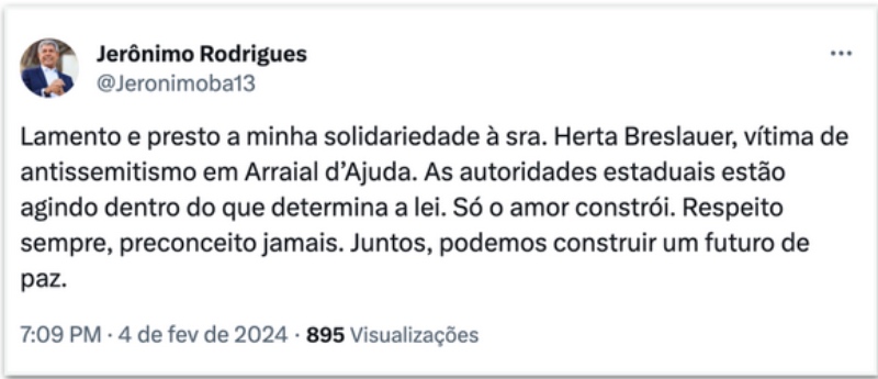 O governador da Bahia, Jerônimo Rodrigues (PT), também se pronunciou sobre o caso, prestando solidariedade a Herta Breslauer. Ele destacou que as autoridades estaduais estão acompanhando o caso de acordo com a lei.
