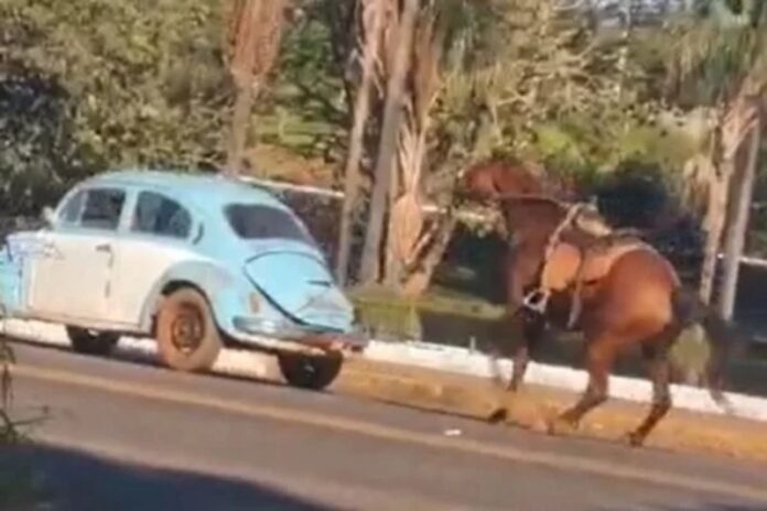 O cavalo foi arrastado por quase 10 quilômetros entre a cidade e a zona rural, mas não sofreu lesões aparentes, segundo a polícia.