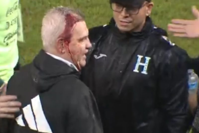 O comandante mexicano circulava pelo gramado quando passou a ser alvo de objetos arremessados pelos apoiadores na arquibancada. Um deles, uma garrafa aparentemente, atinge o topo da cabeça de Aguirre, que se dirigia para cumprimentar o técnico adversário. Ao perceber o sangramento, a comissão de Honduras o cerca e acena para os torcedores cessarem.