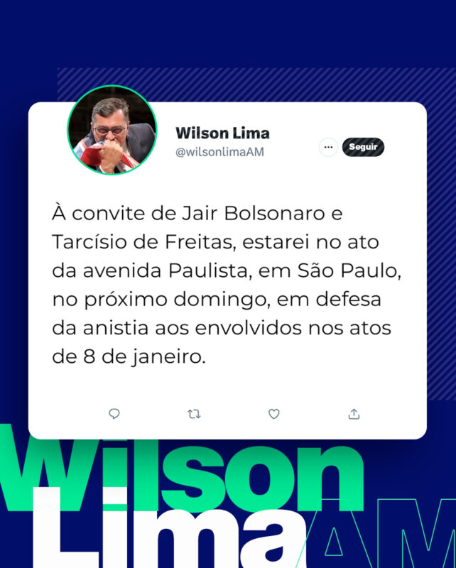 Em publicação nas redes sociais, Wilson Lima afirmou que aceitou o convite feito por Bolsonaro e pelo governador de São Paulo, Tarcísio de Freitas (Republicanos), para se juntar à mobilização. A manifestação tem caráter pró-anistia e reúne apoiadores do ex-presidente, além de lideranças políticas ligadas à direita.