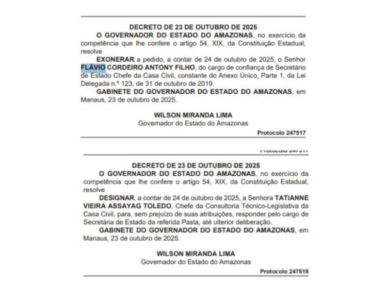 O governador Wilson Lima (União Brasil) exonerou, a pedido, o advogado Flávio Antony do cargo de secretário-chefe da Casa Civil do Governo do Amazonas. A decisão foi publicada no Diário Oficial do Estado (DOE) da última quinta-feira, com decreto datado de 23 de outubro, e confirma a saída já prevista do auxiliar do primeiro escalão.