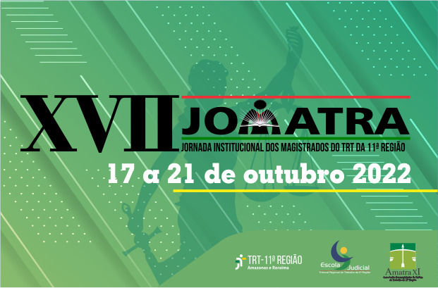 A Escola Judicial do TRT da 11ª Região (Ejud11) promove, no período de 17 a 21 de outubro, a XVII Jornada Institucional dos Magistrados do Trabalho do TRT da 11ª Região (Jomatra). Nos dias 17 a 19/10 o encontro é em formato telepresencial, e nos dias 20 e 21/10 presencial. A Jomatra faz parte do programa de aperfeiçoamento contínuo dos magistrados, visando à melhoria permanente dos serviços jurisdicionais.