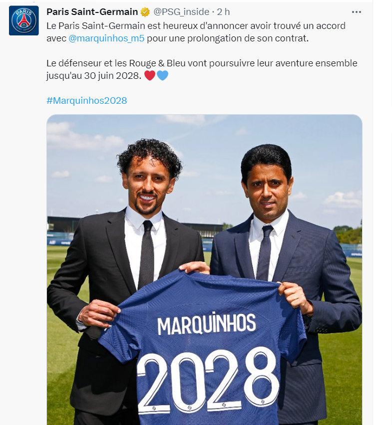 “Estamos muito felizes que Marquinhos tenha renovado com a família Paris Saint-Germain. Lembro-me dele quando entrou para o clube aos 19 anos. Desde o primeiro dia, mostrou muita dedicação e espírito vencedor, lutando sempre pela camisa do Paris Saint-Germain. Seu talento, experiência e compromisso com o clube são excepcionais. Estou confiante de que teremos muito mais sucessos juntos, pois a história de Marquinhos continua no PSG”, disse Nasser Al-Khelaifi, presidente da equipe.